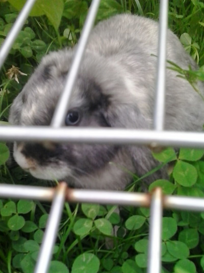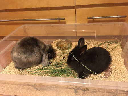Wir suchten einen Kumpel für Muffin und fanden eine Anzeige. Es wurden einige Kaninchenjungs verkauft, die freie Wohnungshaltung kannten und stubenrein waren. Der Papa war ein Zwerglöwenköpfchen, die Mutter ein Riesenkaninchen. Als wir den kleinen Kerl abholten, hatten wir drei schwarze Flauschbällchen zur Auswahl. Ich habe den mitgenommen, der mir zur Begrüßung erstmal in die Schnürsenkel biss. Als wir mit dem Miniflausch im Transportkorb die Wohnung verließen, verabschiedete sich die Verkäuferin mit den Worten. "Ich weiß welchen sie da haben. Es liegen gerade alle friedlich und schlafen. Sonst tobt da noch ein kleiner Teufel und nervt alle anderen."