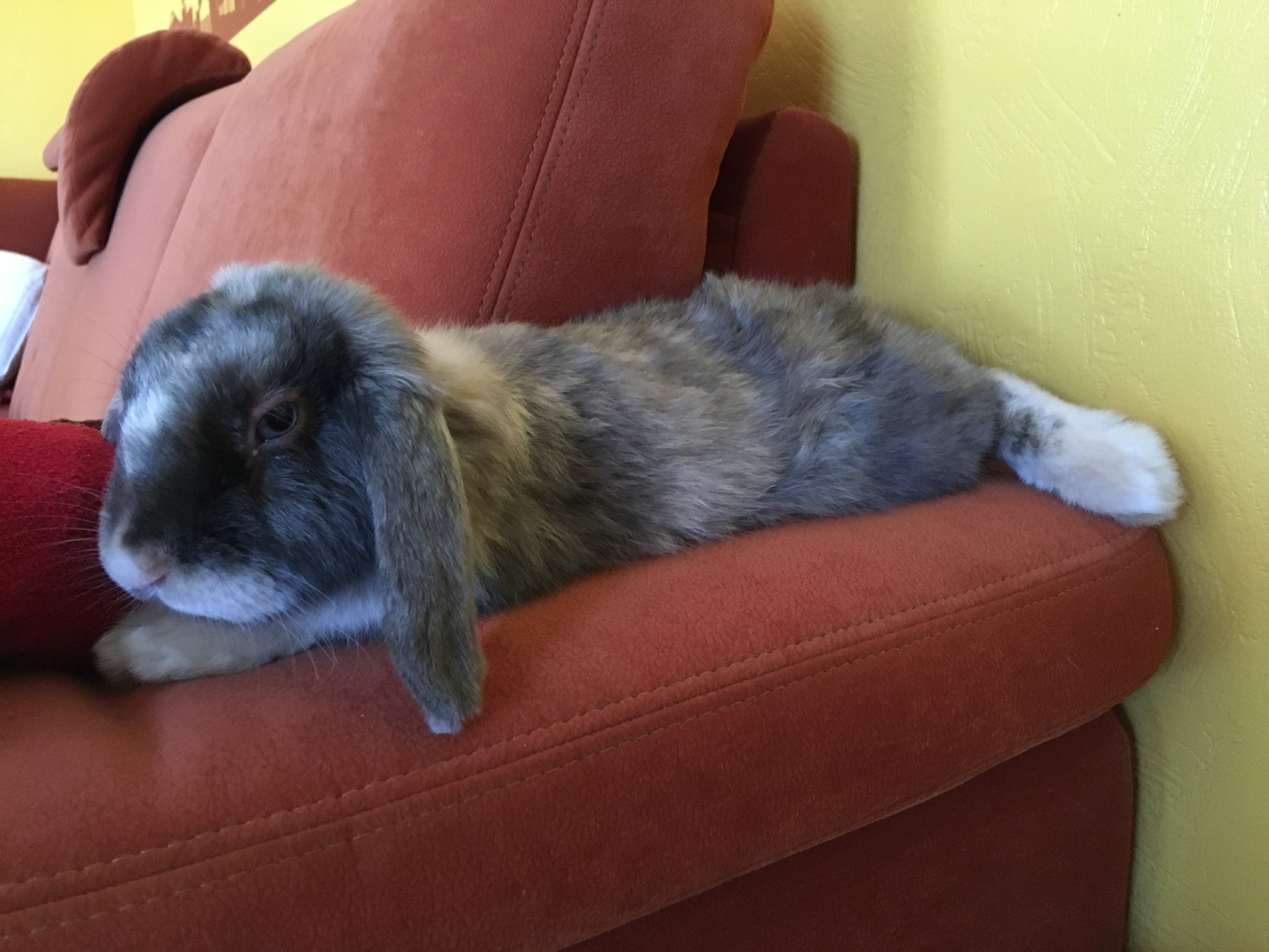 Die Suche nach den Besitzern verlief leider, oder zum Glück, im Sande. Und so blieb er erstmal übers Wochenende. Wie sich rausstellte hatte das Schlappohr ganz genaue Vorstellungen von seinem Zuhause. Draußen? Im Garten? Never! Er beschlagnahmte lieber das Sofa. Da er brav auf die Toilette in den viel zu kleinen Käfig ging, den wir Samstagabend noch schnell organisiert hatten, durfte er frei im Erdgeschoss laufen, nachdem wir alles bunnysicher gemacht hatten.